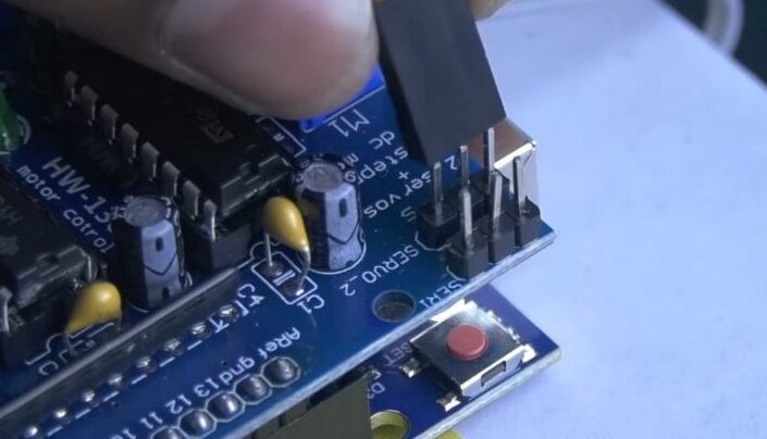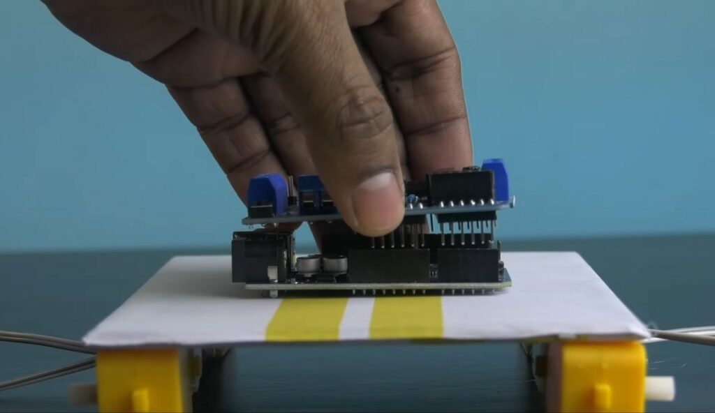 - Mount the L293D motor driver shield on top of the Arduino Uno by carefully aligning the pins.