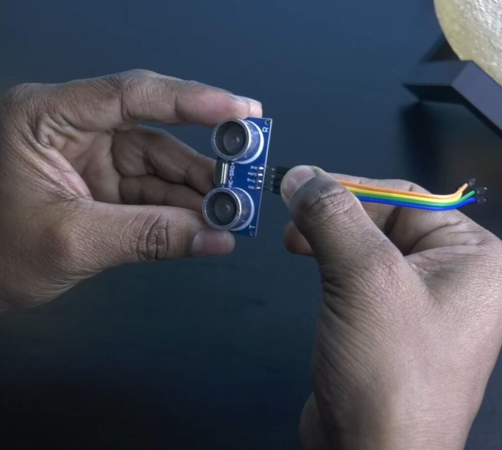 - Connect jumper wires to the 4 pins of the HC-SR04 ultrasonic distance sensor.