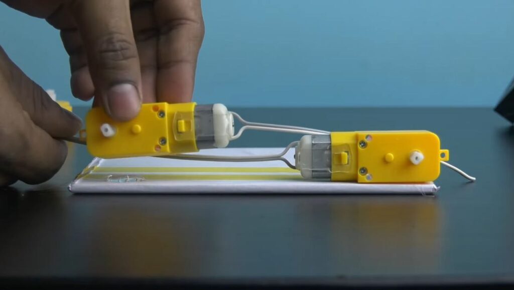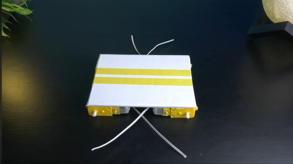 - Apply hot glue to the four corners of the bottom of your cardboard chassis and press the BO motors into the glue, ensuring they are aligned straight and spaced evenly.
