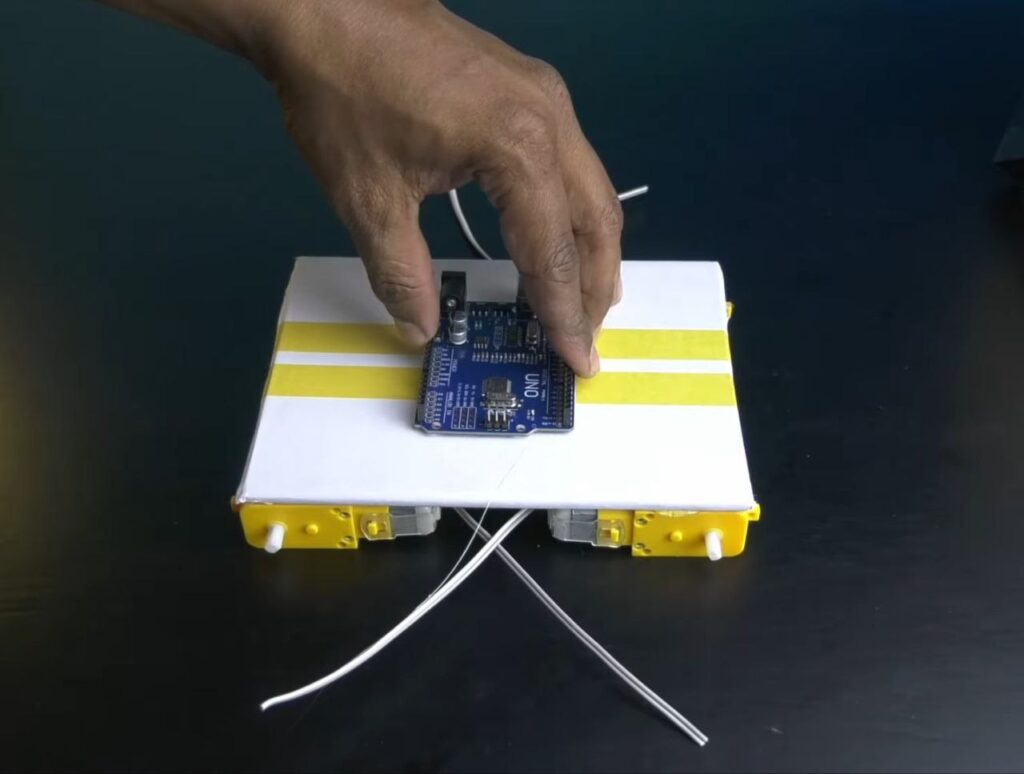 - Flip the chassis over and use hot glue to mount the Arduino UNO firmly in the centre.