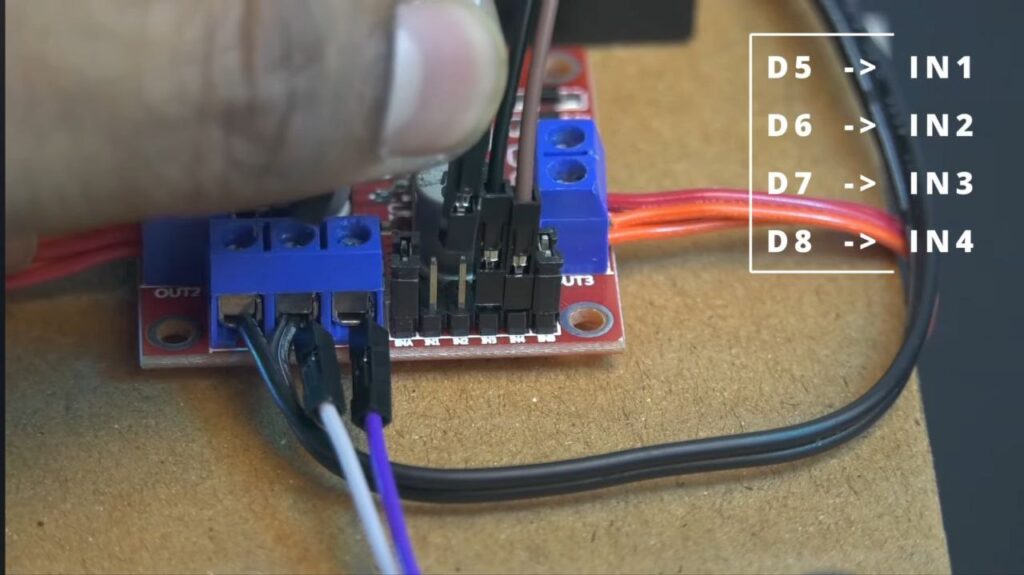 - Motors: Connect the wires from the two motors on the left side to the OUT1 & OUT2 terminals on the L298N. Connect the two right-side motors to OUT3 & OUT4.