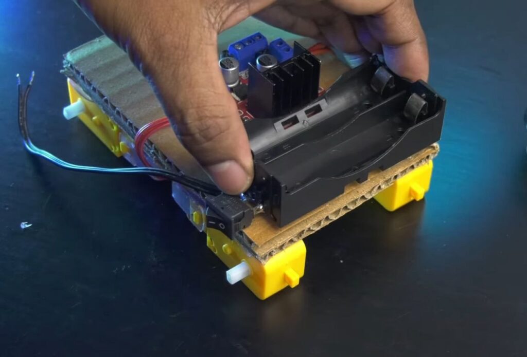 - Flip the chassis over and use hot glue to mount the L298N Motor Driver in the centre and the Battery Holder towards the rear.